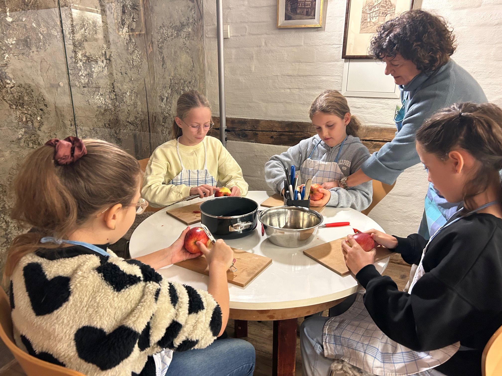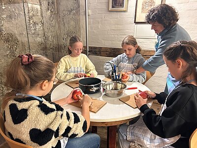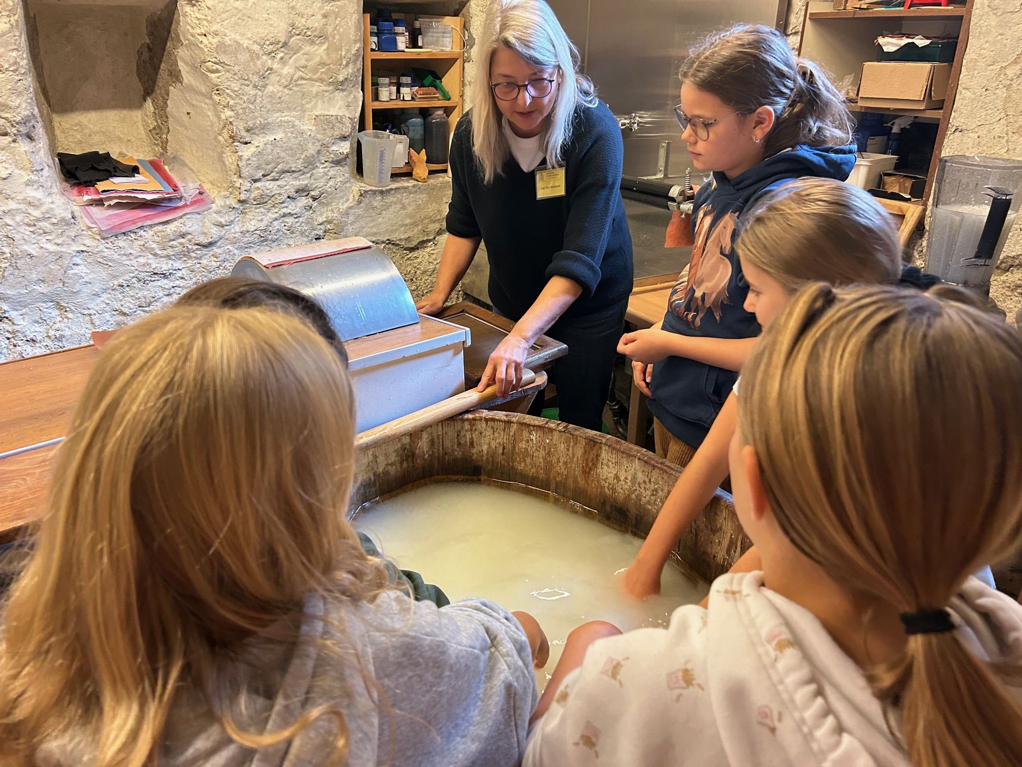 Im Museum erwarteten die Kinder verschiedene Workshops, bei denen sie selbst ausprobieren konnten, wie die Menschen früher lebten und arbeiteten. Beim Kochen lernten sie traditionelle Zubereitungsweisen kennen, während sie beim Drucken und Schreiben erfuhren, wie mühsam das Festhalten von Informationen einst war. Besonders kreativ ging es beim Knüpfen zu, wo handwerkliches Geschick gefragt war. Ein weiteres Highlight war das Papierschöpfen, bei dem die Schülerinnen ihr eigenes Papier herstellen durften.